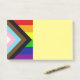 La variante "Progress" du drapeau arc-en-ciel ajoute un chevron le long de l'arbre qui présente des rayures noires, marron, bleu clair, roses et blanches pour amener ces communautés (les personnes marginalisées de couleur, les personnes trans, les personnes vivant avec le VIH/SIDA et celles qui ont été perdues) au premier plan ; "la flèche pointe à droite pour montrer le mouvement, tout en étant le long du bord gauche, montre que des progrès restent à faire."