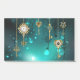 Or, clés antiques avec engrenages et cadrans accrochés sur chaînes dorées sur arrière - plan vert lumineux.