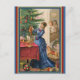 Jolie vieille carte de commerce victorienne avec une mère décorant le sapin de Noël avec ses enfants regardant en émerveillement. Des jouets comme des poupées, des tambours sont sur le sol en attente d'être emballés.
