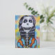 Ce squelette joyeux et souriant du Jour des Morts est issu de mon dessin original au crayon de couleur. Ce squelette est habillé pour sa célébration du Jour des Morts dans une écharpe aux couleurs vives orange et bleue et tient des fleurs blanches. Le fond a une apparence aquarelle avec des jaunes, des roses et des bleus. Voir ma boutique Art by MAR pour plus de produits avec cette image.