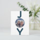 Une simple carte de Noël minimaliste et tendance en bleu et blanc. Sur le devant : Un arrière - plan blanc chic, avec le mot JOY écrit avec des lettres rouges en gras. La lettre O est utilisée comme cadre photo. Personnalisez et ajoutez votre propre photo de famille. Retour : arrière - plan blanc et texte bleu. Ajoutez vos propres salutations de vacances et nom(s) de famille. Les lettres dans le mot JOY comme décoration.