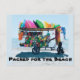 Carte postale avec image du vendeur de plage avec fournitures de plage et les mots, Emballé pour la plage.