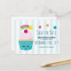 Une carte de naissance (ou autre événement) avec un fond rayé bleu clair et blanc. Superposé sur le dessus est un joli gâteau bleu avec un glaçage rose et un visage souriant kawaii. Une cerise sur le dessus a également un visage mignon. Une étoile filante vole dans les airs.