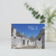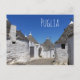 Carte postale de maisons traditionnelles en plâtre blanc avec tuiles en pierre dans des toits coniques dans une petite rue de la ville Alberobello, Vallée d'Itria dans les Pouilles, Italie avec le texte : "Pouilles".