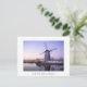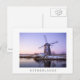 Carte postale avec un moulin à vent lors d'un lever de soleil violet en hiver avec une fine couche de neige et de glace sur l'eau au site du patrimoine mondial de l'UNESCO Kinderdijk aux Pays-Bas avec une bordure blanche et le texte : 'Pays-Bas'.