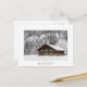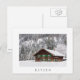 Carte postale d'une maison traditionnelle en bois rond cabine avec volets verts dans une forêt dans la neige en hiver en Bavière à la frontière entre l'Allemagne et l'Autriche avec une frontière blanche et le texte : 'Bayern', allemand pour 'Bavière'.