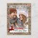 Carte de vacances unique, classique, tendance, rustique et décorative, avec une citation de texte Joyeuses Fêtes Nouvelle année joyeuse, et place pour personnaliser ou personnaliser avec une photo et des noms (ou nom de famille) de votre choix sur un style de cottage rustique motif de texture de planches de grange de ferme en bois patiné, et des confettis éparpillés de couleur rouge et verte festive classique.