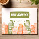 Motif de style Dessin avec des bâtiments rétro orange et vert pour un nouveau faire-part d'adresse très exclusif. ♥ Collection correspondante pour la COORDINATION DES ARTICLES. ♥ Oeuvre originale de PUPSIKU STUDIO. Produit 100% exclusif.