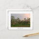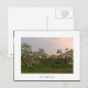 Carte postale de multiples oliviers et quelques fleurs rouges de pavot dans une oliveraie au coucher du soleil en Italie avec une bordure blanche et le texte : 'Pouilles'.