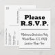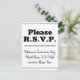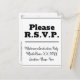 Ce design de carte postale RSVP respectable et propre comporte le message "Please R.S.V.P." sur le devant, ainsi qu'un nom d'événement/d'occasion personnalisable. Il comporte également un formulaire RSVP personnalisé au verso que le destinataire doit remplir, ainsi qu'une adresse personnalisée à laquelle les cartes RSVP complétées seront envoyées par la poste. Les cartes RSVP comme celle-ci peuvent être utilisées pour savoir qui assistera à une fête de remise de diplômes, à une fête d'anniversaire, à une réception de mariage ou à tout autre événement.