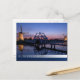 Carte postale de deux moulins à vent illuminés et d'un pont-levis avec réflexion dans l'eau du canal à la dernière lumière au coucher du soleil à Kinderdijk dans la Pays-Bas avec une barre de décoloration et le texte : "Pays-Bas".