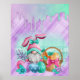 Ostersonniger Gnome mit rosafarbenen, sonnigen Ohren, die in Frühlingsblumen mit dekorierten Eiern und einem Korbkorb mit Karotten Set auf einem aquamarinen und lila karierten Hintergrund mit pastellfarbenen Süßspeisen Tropfen sitzen.