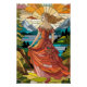 Dieses lebendige Glaskunstwerk zeigt eine wunderschöne Frau in einem verzierten, fließenden Kleid, ihr langes Haar kaskadiert anmutig auf einer felsigen Landschaft. Die Frau scheint einen atemberaubenden Blick zu genießen, der majestätische Berge, einen ruhigen See und einen dramatischen Himmel umfasst. Das Kunstwerk ist reich an Details, mit kühnen, bunten Scheiben, die einen dynamischen Kontrast zwischen der Figur und der natürlichen Szene schaffen. Der Buntglaseffekt steigert die Schönheit der Landschaft und die Eleganz der Frau und ist somit perfekt für ein beeindruckendes Poster oder Wandkunstwerk, das Schönheit und Ruhe ausstrahlt.