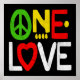 Un Amour ! Un texte rouge, vert et or joyeux et coloré, "ONE LOVE", y compris un SIGNE DE PAIX et le COEUR. Cette image, citée par le roi du reggae, symbolise la musique vivante, le rythme et l'ambiance qui identifie le genre de musique Roots/Reggae, la culture du reggae, la Jamaïque et l'île des Caraïbes.