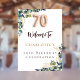 Un arrière - plan blanc chic. Décoré avec des feuilles d'eucalyptus couleur verte, des sprigs, de la verdure, des feuilles faux or. Personnalisez et ajoutez le nom. Lettres noires et dorées. Le numéro 70 est écrit avec une police de style ballon.