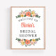 Affiche ou panneau de bienvenue pour la fête de fiançailles de mariage avec un texte élégant encadré par un design de couronne florale fantaisiste d'été ou d'automne avec des fleurs aquarelles colorées, des feuilles et de la verdure dans des nuances de rose blush, jaune doré, corail, rouge orange, violet pourpre et vert. Inclut un texte personnalisé élégant qui peut être personnalisé avec le prénom de la mariée.