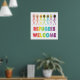 Refugees Welcome design présente une collection diversifiée de personnages en allumettes dans un groupe accueillant et amical. Le libellé et les couleurs célèbrent la diversité, les nouveaux arrivants et visent à faire en sorte que les réfugiés et les migrants se sentent accueillis.