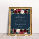 Bienvenue à votre mariage avec notre poster en Fleur de Fleur de Fleur de Fleur de Fleur de Fleur de Fleurs de Couleur de Bijoux et de verdure botanique luxuriante, avec "bienvenue à notre bonheur toujours après", vos noms, et rendez-vous mariage dans un mélange chic de caractères modernes de bloc et de calligraphie à la main sur un arrière - plan bleu marine riche.