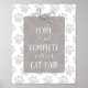Affiche de typographie de style Scrapbook avec la phrase "HOME is not COMLETE without CAT HAIR." Faux ruban et bouton sur un arrière - plan qui a des empreintes de pattes animaux gris. Conçu par Rycky Creations ; éléments de Pixelscrapper.