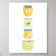 Cette affiche de confitures mixtes comporte plusieurs bocaux de conserves typiques remplis de six types différents de confitures dans un style graphique simple avec des étiquettes de confitures de fruits dans plusieurs couleurs jaunes et vertes. Consultez la collection pour mélanger et assortir cette impression de confitures mélangées avec d'autres estampes en conserve. Vous pouvez agrandir ou réduire l'impression de confiture d'ananas ou la transférer vers d'autres produits muraux.