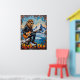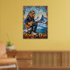Cette œuvre d'art dynamique présente un lion, portant des lunettes de soleil cool et une veste en cuir, jouant intensément d'une guitare électrique tout en étant accroupi sur une montagne enneigée. En dessous, un lac bleu serein est visible, flanqué de pins et de sommets lointains. Les coups de pinceau épais et texturés de la peinture donnent une sensation brute et énergique à la neige et à l'eau, transmettant puissamment l'esprit "Rock or Die" de cet artiste unique.