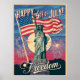 La Statue de la Liberté affichée en évidence au centre. Un drapeau américain vibrant agitant dans l'arrière - plan avec des feux d'artifice éclatant autour. "Happy 4 juillet !" en caractères vintages et gras en haut, avec "Celebrate Freedom" dans un script plus petit et élégant en bas. Le rouge, le blanc et le bleu traditionnel dégagent une atmosphère vintage et un peu défraîchie.