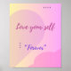 Cette oeuvre murale met l'accent sur le message stimulant "Aimez-vous", écrit dans une typographie audacieuse et élégante pour inspirer l'autonomie et l'autosoin. Placé contre un arrière - plan calme de dégradé pastel, l'oeuvre dégage chaleur et positivité. Des accents délicats comme les coeurs, des motifs floraux doux ou des étincelles subtiles entourent le texte, créant un design harmonieux et accueillant. Parfait pour n'importe quel espace, ce morceau sert de rappel doux pour donner la priorité à l'amour-propre et chérir votre individualité.