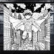 Une page de coloriage avec un super-héros de garçon animé volant à travers les cieux de la ville. Mignonne affiche de moi couleur pour un garçon.