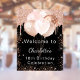Une affiche de bienvenue pour une fête d'anniversaire girly et glamour (tout âge). Un élégant arrière - plan noir décoré de gouttes d'or rose, de la peinture goutte à goutte, ballons. Personnalisez et ajoutez un nom.