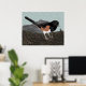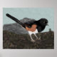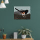 Impression de l'affiche avec mon image médiatique mixte originale d'une broche de l'Est sur le sol parmi les aiguilles et les brindilles de sapin tombées. L'oiseau d'aquarelle est principalement noir avec une poitrine blanche et des côtés de couleur rouille. Derrière, il y a une grande pierre contre un arrière - plan pâle et vert pâle.