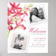 Affiche de bienvenue de mariage avec fleurs d'orchidées rouges Phaiocalanthe Parkside aquarelle botanique peinte à la main. Personnalisez avec vos propres noms de mariage et deux photos. D'autres articles assortis sont disponibles. © Peinture et conception botanique originale à l'aquarelle par Sarah Trett pour www.mylittleedenweddings.com sur Zazzle.