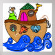 Illustration fantasque mignonne de l'Arche de Noé flottant au-dessus des vagues d'inondation. Image disponible sur divers cadeaux et produits.