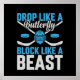 Affiche de gardien de but de hockey avec texte bleu et blanc, casque avec masque, rondelles et bâtons de hockey lit comme Tombez comme un papillon Arrêtez comme une bête !