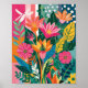 Une peinture vibrante et abstraite avec une variété de formes abstraites stylisées. L'oeuvre est remplie de couleurs vives et saturées, dont les tons vert foncé, orange, jaune, vert et bleu. Les formes ont de gros pétales exagérés avec des motifs complexes, tandis que les bandes sont représentées dans des formes et des tailles variées, créant un effet luxuriant et superposé. L'arrière - plan est composé d'un mélange de couleurs solides, de lavages en dégradé et de pois ludiques, ce qui ajoute profondeur et contraste. Le style général est moderne, expressif, et plein d'énergie, avec un accent fort sur la couleur et la forme, vectoriel plat, graffiti, acrylique aquarelle, libellule blanche, collage d'effet de timbre plat. teintes rouges, cachemire motif, libellule blanche dans le coin