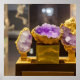 affiche Extraordinaire de l'art numérique photoréaliste avec une image générée par l'IA d'un magnifique trio de géodes de cristal améthyste sur des piédestales d'or comme s'il était exposé dans un musée