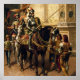 Des chevaliers médiévaux en armure brillante sont montés sur des chevaux, tenant des lances et portant des casques en lambeaux. Le cadre semble être un grand hall ou une cour ornée de détails et de bannières complexes. Ce tableau est "To the Joust" de Cesare Detti.