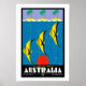 Affiche de voyage pour l'Australie faisant la promotion de la Grande barrière de corail au Queensland avec trois îles tropicales de poissons et de palmiers.