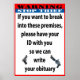 AVERTISSEMENT - ARRÊTEZ LE VOLEUR - Si vous voulez pénétrer dans ces locaux, veuillez avoir votre pièce d'identité avec vous afin que nous puissions écrire votre nécrologie - Poster/Signet - Avoir Laminé pour un usage extérieur...