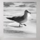 Une mouette qui marche à travers la mousse d'une vague lavant sur la plage en noir et blanc.