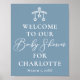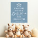 Ce poster de bienvenue aux baby showers bleus poussiéreux présente un jouet chic mobile d'étoiles suspendues au-dessus de votre élégante typographie blanche minimaliste. Décor simple et sucré de douche bleu gris pour une maman qui attend un bébé garçon.
