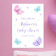 Ce poster de baby shower présente des papillons blancs, des fleurs et des points de confettis, de l'aquarelle blanche violette, rose et aqua. Personnalisez-le avec un nom et une date. Cette affiche fait partie d'une collection présentant une gamme complète de produits de baby shower assortis.