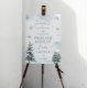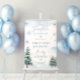 Un petit flocon de neige est sur le chemin Panneau de bienvenue Baby shower bleu hiver merveilleux signe de bienvenue avec des flocons de neige et des pins.