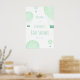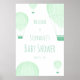Une affiche d'accueil baby shower montgolfière. Cette enseigne d'accueil personnalisable présente un design avec des montgolfières et des couleurs vert et blanc. Ajoutez simplement votre nom et votre date, ajoutez ce signe à votre panier et profitez de votre baby shower ! Ballotte à air chaud Baby shower vert Accueil Poster Signal Conception des fêtes | ©Melissa Patton - Artiste/Illustrateur