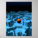 OEuvre numérique d'une sphère rouge tridimensionnelle équilibrant au bord d'un paysage montagneux géométrique bleu