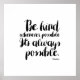 L'affiche de Our Be Kind cite le Dalaï Lama qui dit "Soyez gentil chaque fois que possible. C'est toujours possible." L'affiche mesure 24" x 24", cependant, le libellé réel mesure environ 12" x 12", car il y a un espace blanc généreux de 6" autour de la pièce.