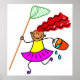 Un joli dessin de caricature fantasque d'une petite fille à la plage avec son filet de pêche et son seau d'eau prêt à mettre ses créatures marines dans.