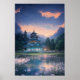 Un temple japonais traditionnel en bois aux murs bleus se dresse au bord d'un lac serein. Le temple est entouré d'une forêt verdoyante, ajoutant à la tranquillité du cadre. Derrière le temple, la forêt verdoyante offre un cadre paisible à la scène tranquille.