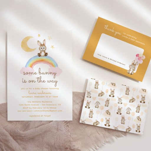 Ce design fait partie de la collection de baby showers "Certains lapins sont sur le chemin". Il présente des motifs mignons avec des lapins aquarelles, des fleurs de pâques, des arcs-en-ciel et des nuages dans des tons neutres (marron, orange, beige, jaune et rose roux). Suite de papeterie amusante avec citation lapin.