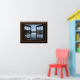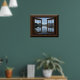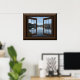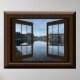 Cette affiche présente un magnifique lac à travers une fenêtre ouverte.