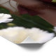Une belle fée aux cheveux bouffis aux ailes blanches et chamarrées portant une jolie robe bordeaux et un collier de grenat tient une seule oeillet blanche debout dans un champ d'oeillets.